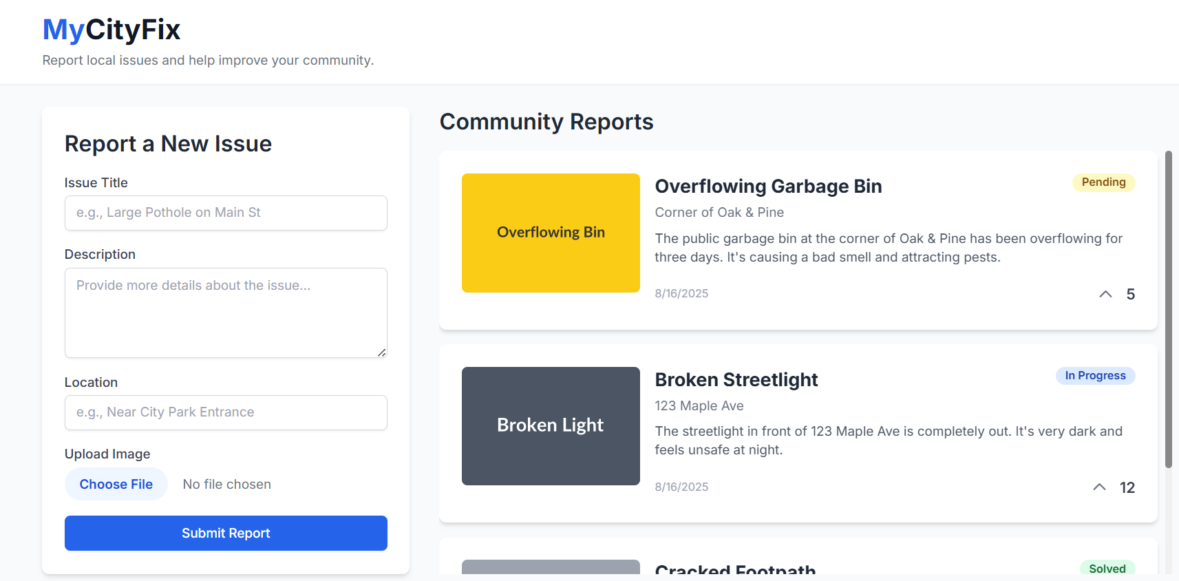 MyCityFix is a full-stack MERN web app that enables citizens to report local issues—like potholes, streetlight failures, or garbage overflow—on an interactive map. Users can upload images, upvote nearby complaints, and track their resolution status, while admins manage issues via a dedicated dashboard.
